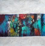 2019Gemengde techniek met collage van delen van eigen gemaakt werk. 2 vertikale banen bewerkt met reliëflaag.