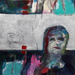 2019Gemengde techniek met collage van delen van eigen gemaakt werk. 1 baan wit waardoor portret eruit lijkt te springen hiernaast in een tekenlijn een gezicht getekend.
