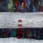 2019Gemengde techniek met collage van delen van eigen gemaakt werk. 2 banen bewerkt met reliëflaag. lijnen en rode vlekjes op plexiglas waardoor schaduwval een onderdeel van het werk wordt