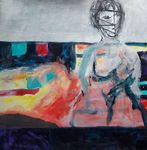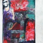 2019Gemengde techniek met collage van delen van eigen gemaakt werk. 1baan bewerkt met reliëflaag. Lijnen portret en rode vlekjes op plexiglas waardoor schaduwval een onderdeel van het werk wordt.