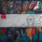 2019Gemengde techniek met collage van delen van eigen gemaakt werk. 2 banen bewerkt met gips en zand waardoor reliëf in banan in het werk zichtbaar is.