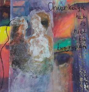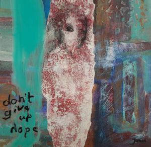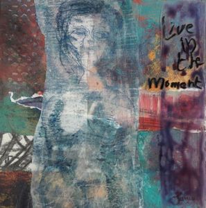 2020De achtergrond is geschilderd met acrylverf, hierin is een mensvorm te herkennen. Er is ruimte tussen plexiglas en achtergrond. Met was en papier een tussenvorm die voor de verbinding zorgt met de plexiglas voorkant. Voor dit vlak staat de tekst. Er is een turquoise vlak geschilderd. Bij lichtval ontstaat er een schaduwvlak op de achtergrond. Deze schaduwval is een wezelijk onderdeel van het werk.